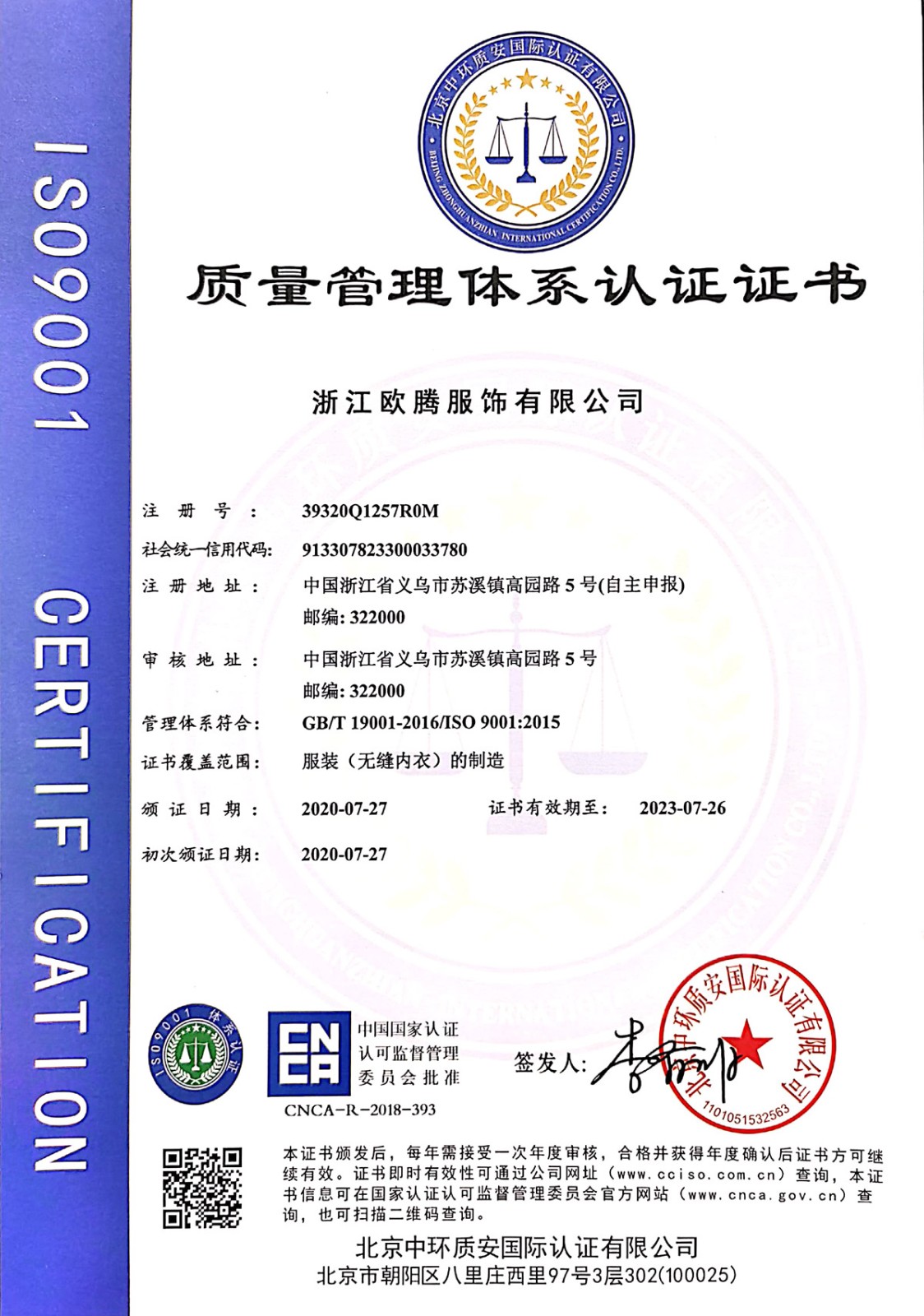 浙江歐騰服飾有限公司位于世界小商品之都-義烏。創(chuàng)立于2015年,是一家專業(yè)生產(chǎn)無縫針織運動服飾和內(nèi)衣的工貿(mào)一體企業(yè),擁有自主出口權。 工廠的占地面積約16000平方米 ,引進了大型圣東尼、高騰等多種先進的制衣設備300余臺。月產(chǎn)能可達90萬件。 歐騰服飾每年投入近百萬資金打樣開發(fā)新產(chǎn)品,有著一支高素質(zhì)設計、技術員工隊伍。工廠先后通過了ISO 9001質(zhì)量管理體系認證、BSCI認證、GRS認證、OEKO-TEX國際生態(tài)紡織品認證等多項專利檢測報告。可提供OEM&ODM服務。歐騰服飾以一套完整、科學的質(zhì)量管理體系,生產(chǎn)的服裝從原材料紗線到成衣,質(zhì)量完全能夠滿足國內(nèi)、國際質(zhì)量要求。獲得了客戶一致好評。工廠先后獲得省科技型企業(yè)、國家高新企業(yè)、義烏市誠信講信用單位、規(guī)上企業(yè)、信用AAA級等榮譽。